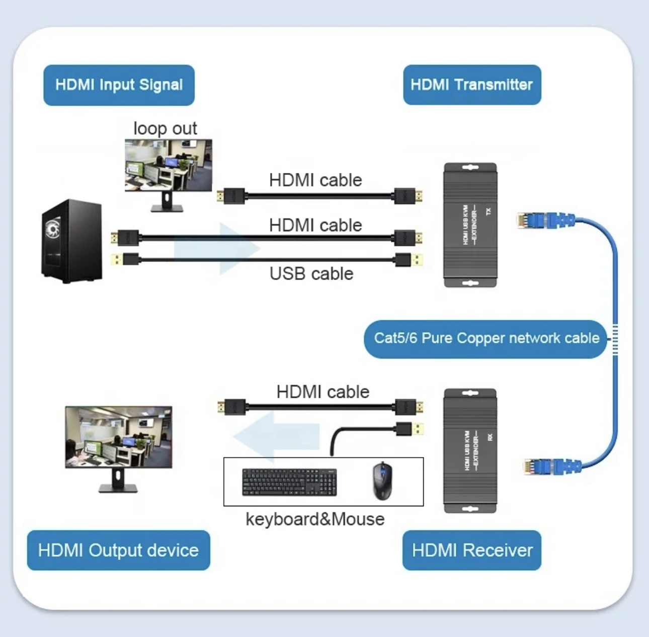 • Supports 1080p@60Hz resolution; Real-time transmission, low latency; Support KVM function conveniently by remote control; Transmission distance can be up to 60m by Cat6 cable, up to 50m by Cat5E and Cat5 cable